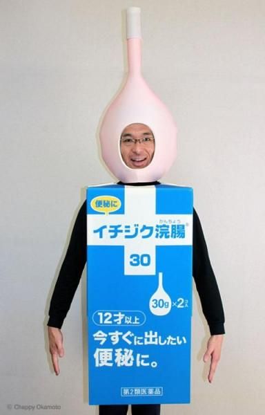 写真はオーダーメイドでお作りした、イベント用の「イチジク浣腸((体用全身)かぶりもの(着ぐるみ)」の制作例です。ウレタン製で軽く、動きやすいものです。