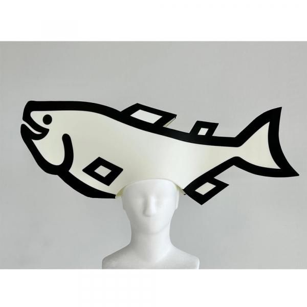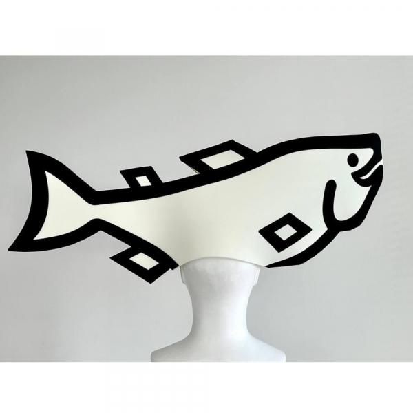 写真はオーダーメイドでお作りした、イベントスタッフ用の「サーモン(鮭・しゃけ)」のかぶりもの制作例です。企業ロゴの「フライングサーモン」を立体的に被れるようにデザインしました。